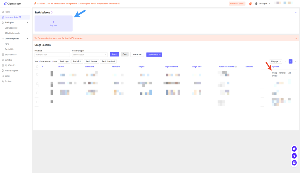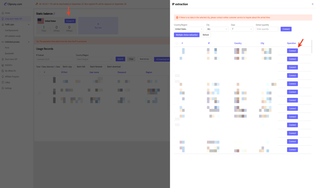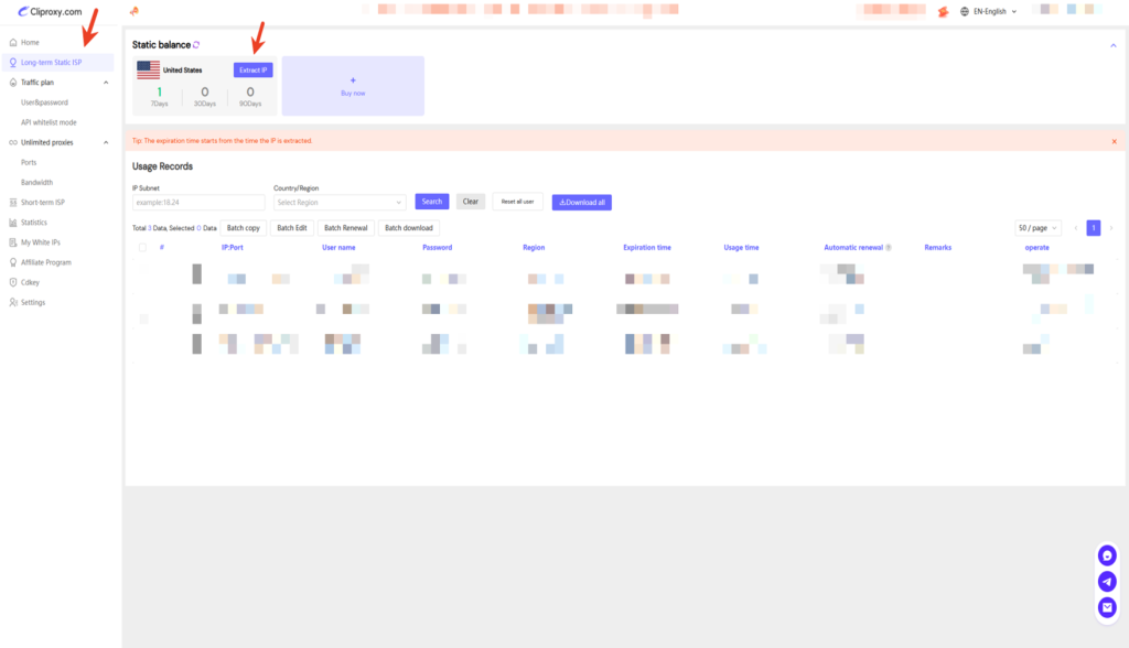 4. Go to the Cliproxy dashboard on the left side and select the type of IP you want to extract (in this case, a long-term static ISP). Then, on this page, in the 【Buy Now】 section, select the detailed parameter information, click 【Purchase】, and you will get your target IP list. Finally, click 【Extract】, and clicking 【Extract】 will allow you to view your IP details in the list below. Then click 【Use】.
