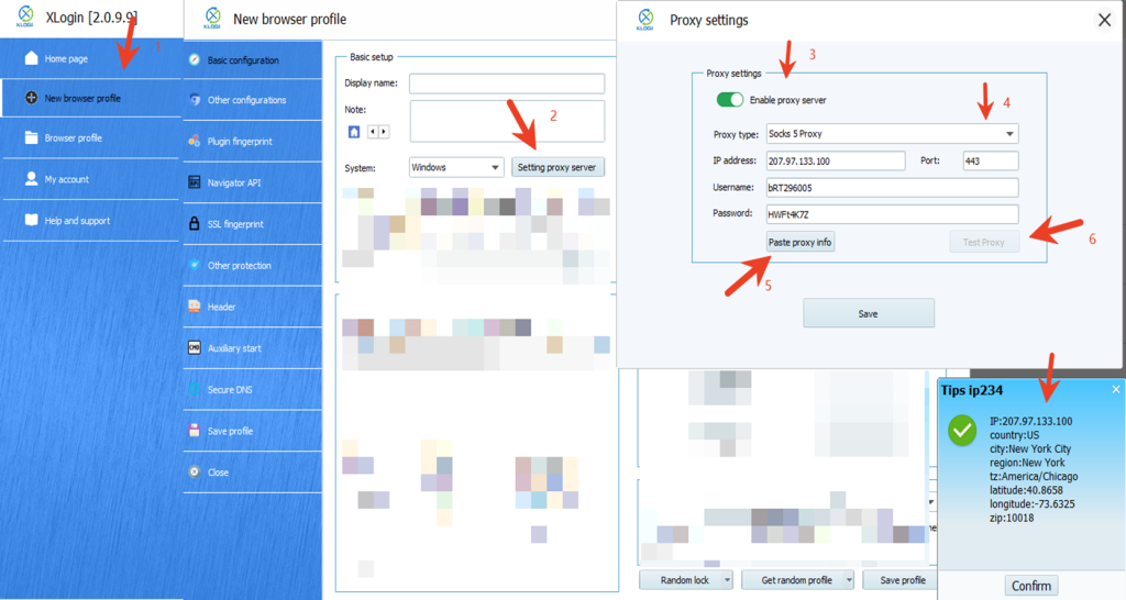 7. Return to the Xlogin client, and Click "New browser profile" ,then enable the "Settings proxy server".