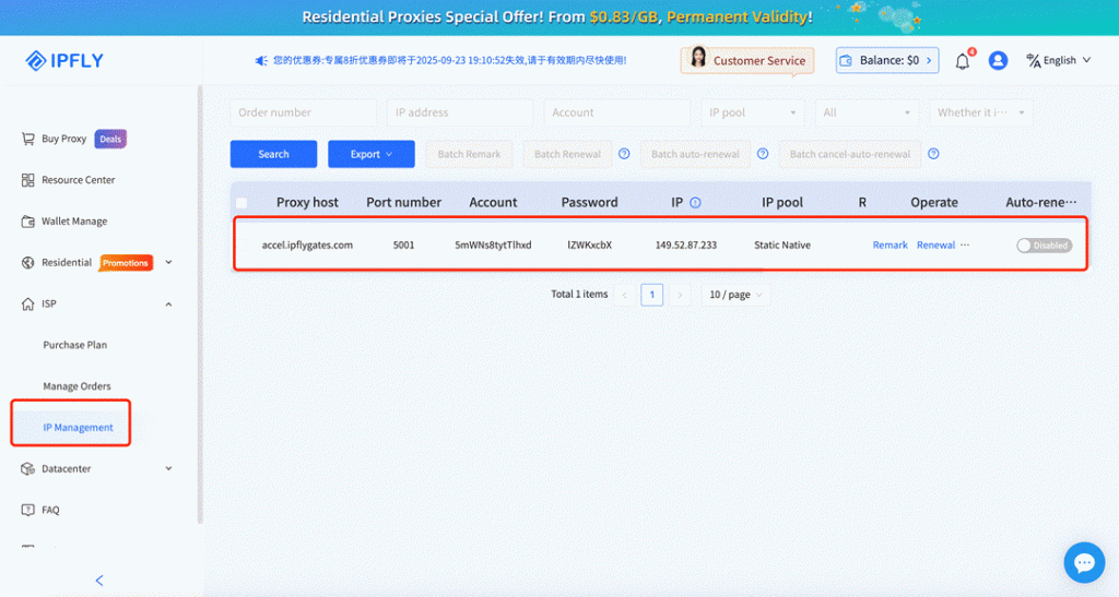 Step 4: After successful payment, click “IP Management” in the left menu bar to find your proxy host, port, username, and password.