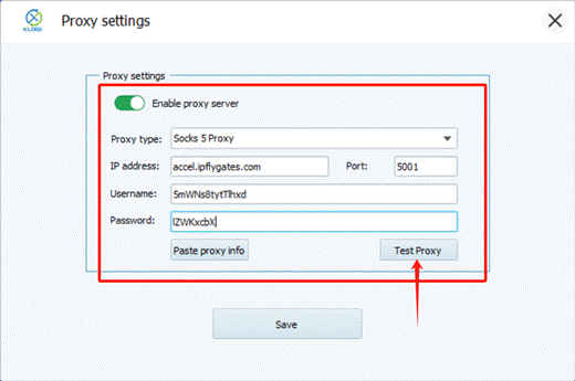 Step 9: Click "Enable proxy server" and enter the IPFLY proxy host, port, username, and password. Then click “Test Proxy.” After the test completes, click “Confirm.”