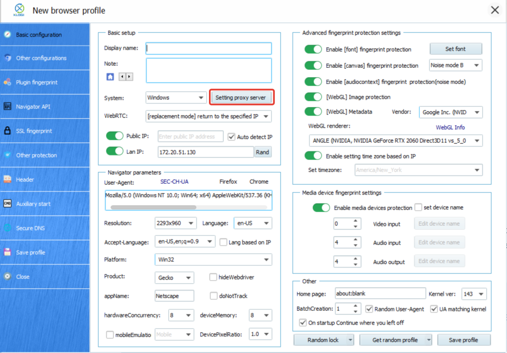 4. Open XLogin and create a new browser profile or select an existing one. Click "Setting proxy server" to open the proxy configuration window (Free Trial available).