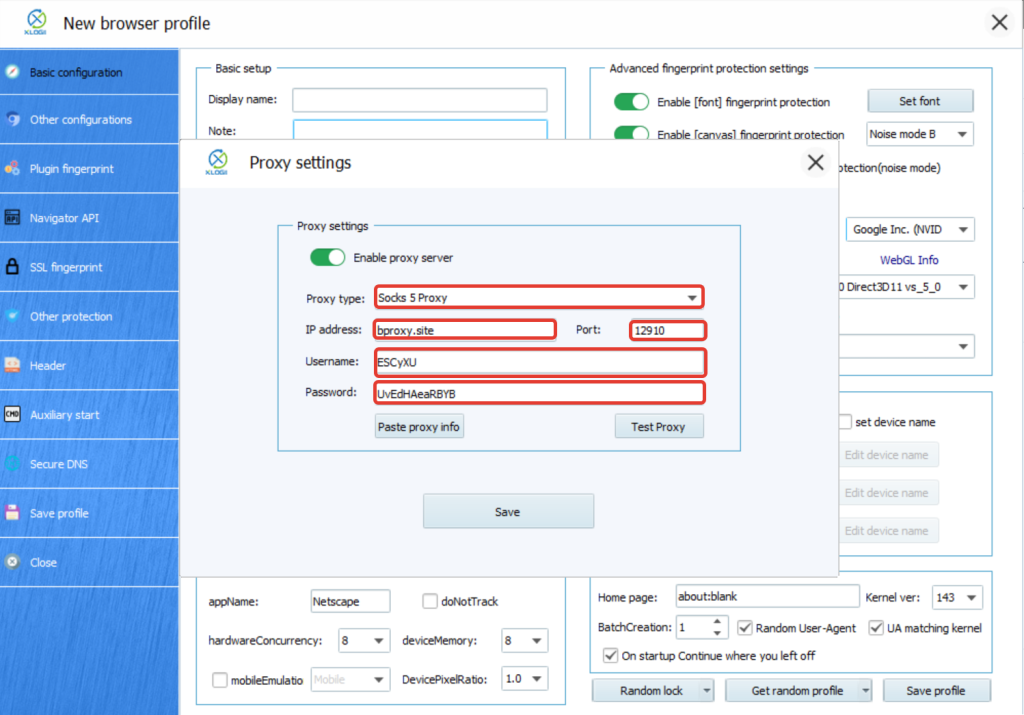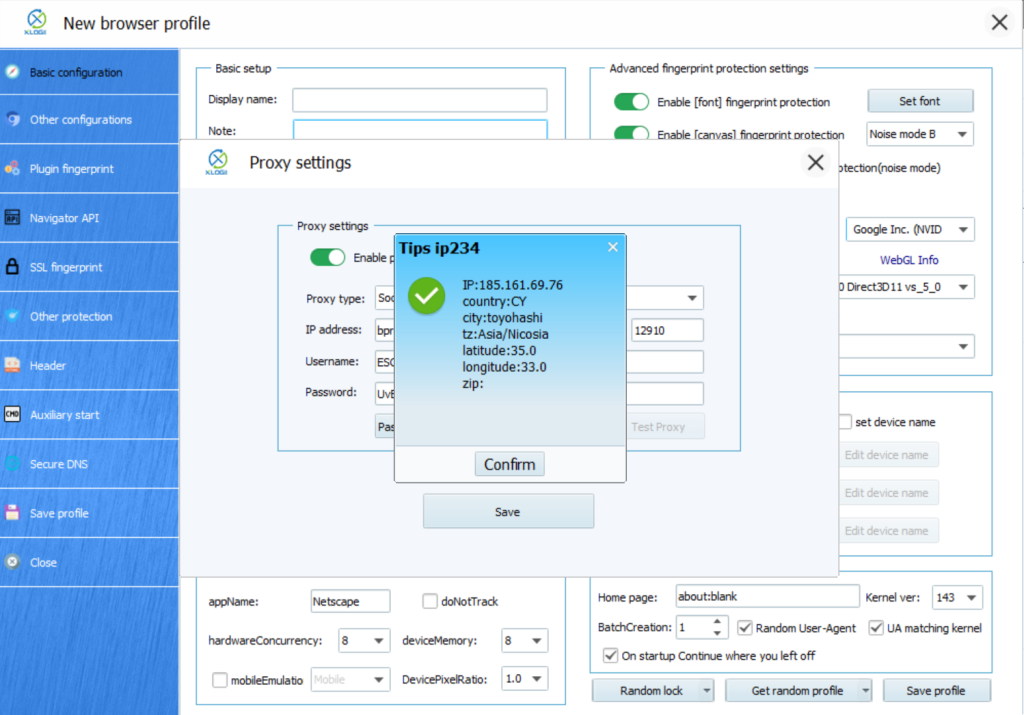 6. Click "Test Proxy". If the connection is successful, XLogin will display the proxy IP information including the country and IP address. Click "Save" to apply the settings.
