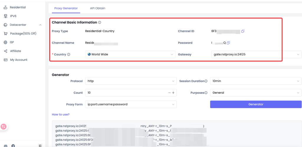 3. After purchasing, go to your Nstproxy Dashboard → “My Proxies” to obtain your proxy credentials (IP/Port, Username & Password).
