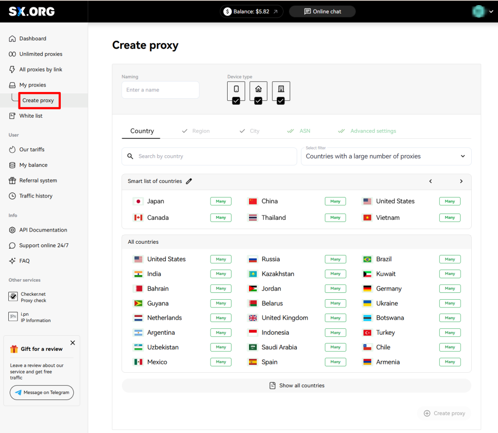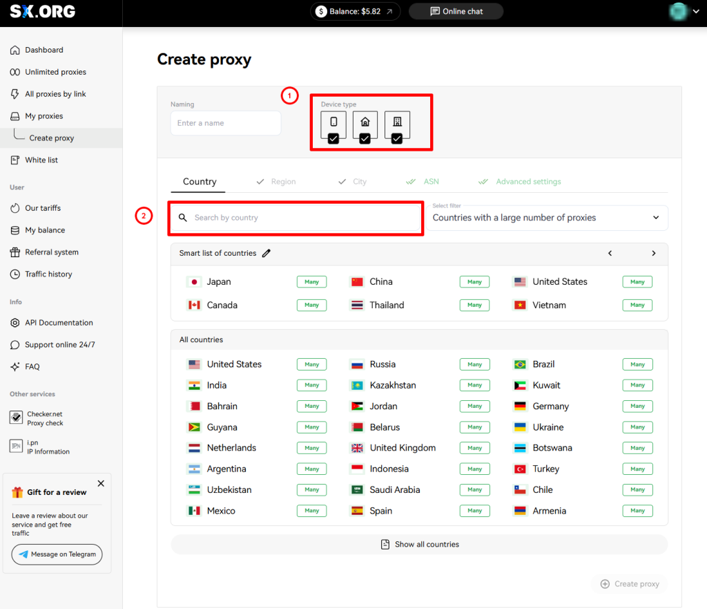 On the first step of creating a proxy, you will be asked to select a country and a proxy type. Above the country selection field you can set the IP type: mobile, corporate or residential (1). Note that all 3 types are selected by default, but for the most stable performance, we recommend selecting only one of those types.