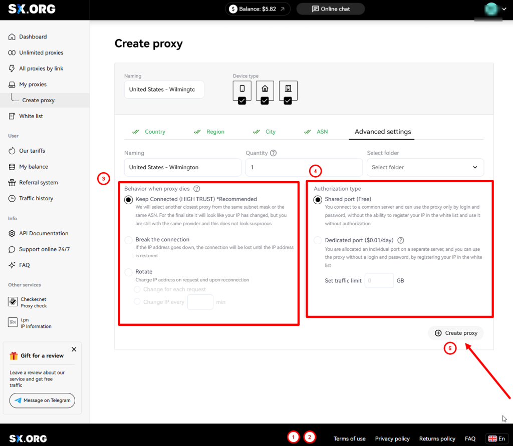 At the last step you can choose a name for your proxy, quantity, rotation type and authorization type.