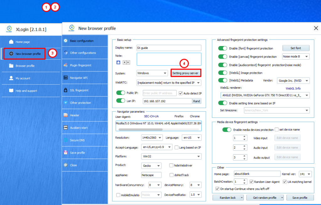Open the New browser profile section and find the Setting proxy server section.