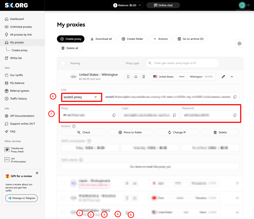 Next, copy the proxy URL, login and password (7)